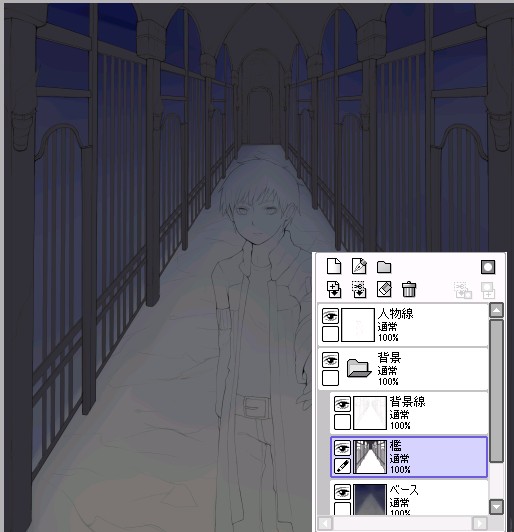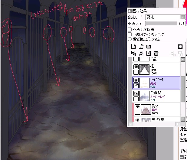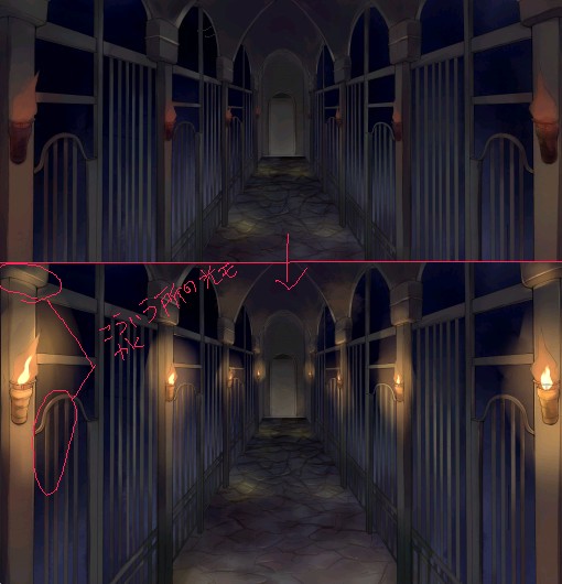 クリッピングをすると、すぐ下のレイヤー(この場合は牢屋のベースカラー)の不透明部分に色がはみ出なくなるので便利です。
